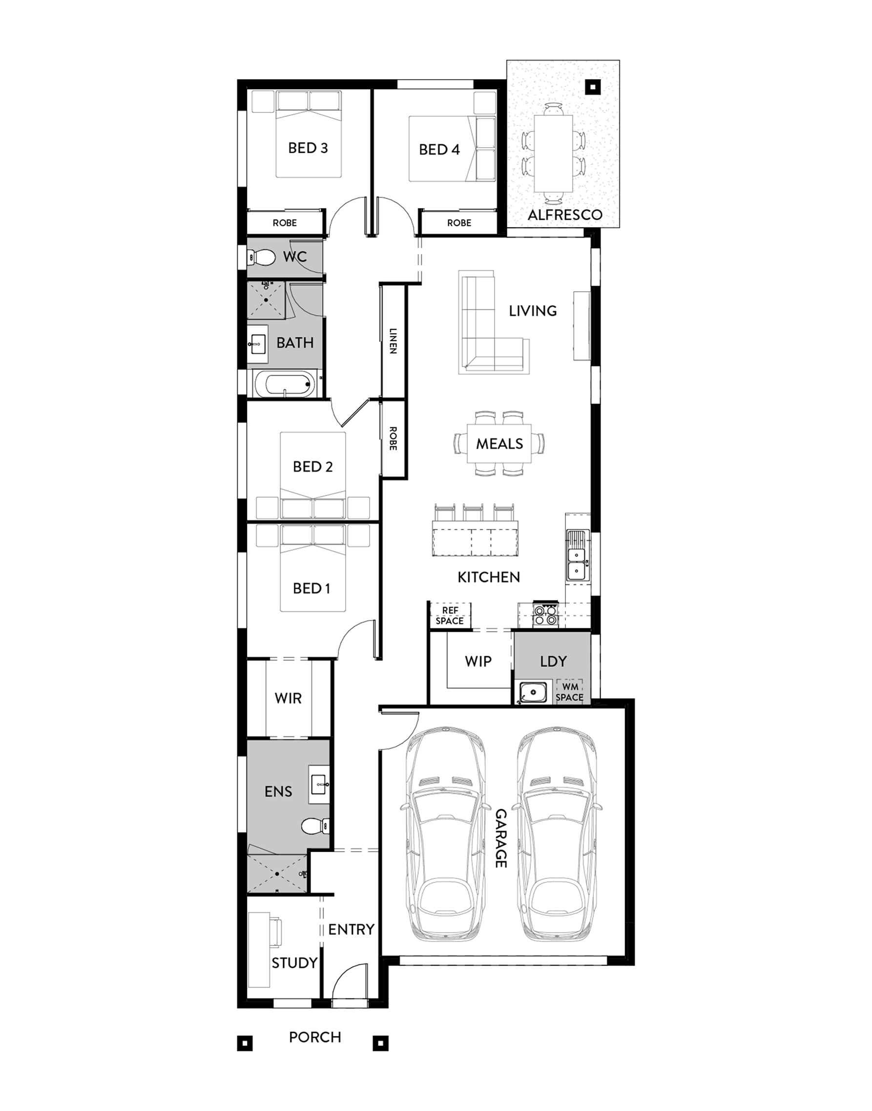 The Abbey 191 is designed for families who want more space to live, work and grow together. With four bedrooms and a welcoming study at the entry, this home offers flexibility for everything from working at home to hosting overnight guests. At its heart, the light and airy kitchen, meals and living area connects seamlessly to the alfresco, creating the perfect setting for family dinners, weekend barbecues and relaxed afternoons outdoors. A private master suite with walk-in robe and ensuite ensures parents have a sanctuary to retreat to at the end of the day, while the remaining bedrooms are well positioned around the main bathroom.