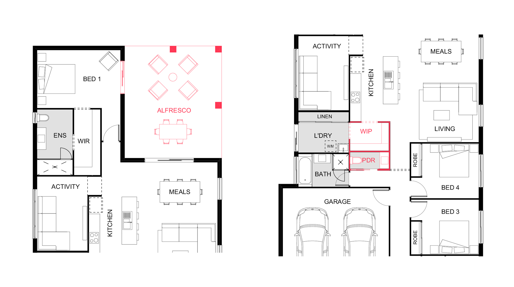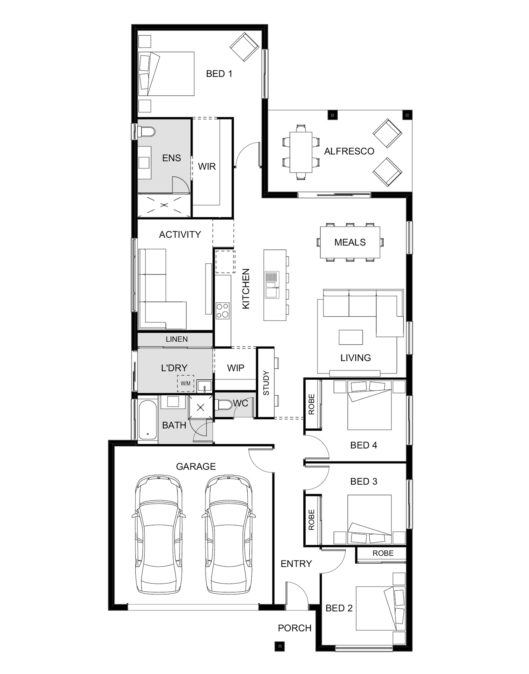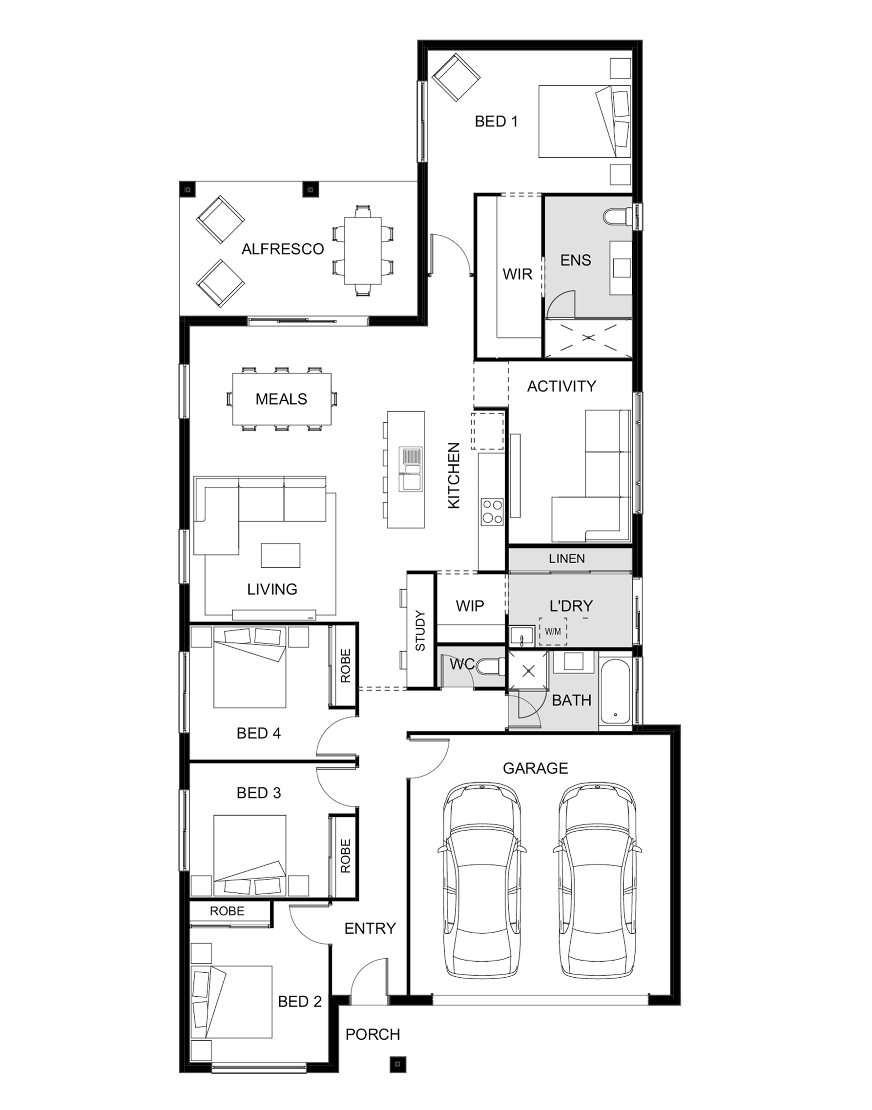 With an alfresco flowing out from the spacious open plan living area, this home from our Luma range is the perfect single storey home design for lazy days spent with friends and family. The gourmet kitchen features an island bench and a walk-in pantry connected to an oversized laundry. This stylish and flexible 4-bedroom house plan includes a study nook near the kitchen, so you can spend time with the kids while they do their homework. The separate activity room is perfect for enjoying a movie, while the private master suite – located at the rear of the home away from the other bedrooms – features an ensuite, separate powder room and huge walk-in robe.
