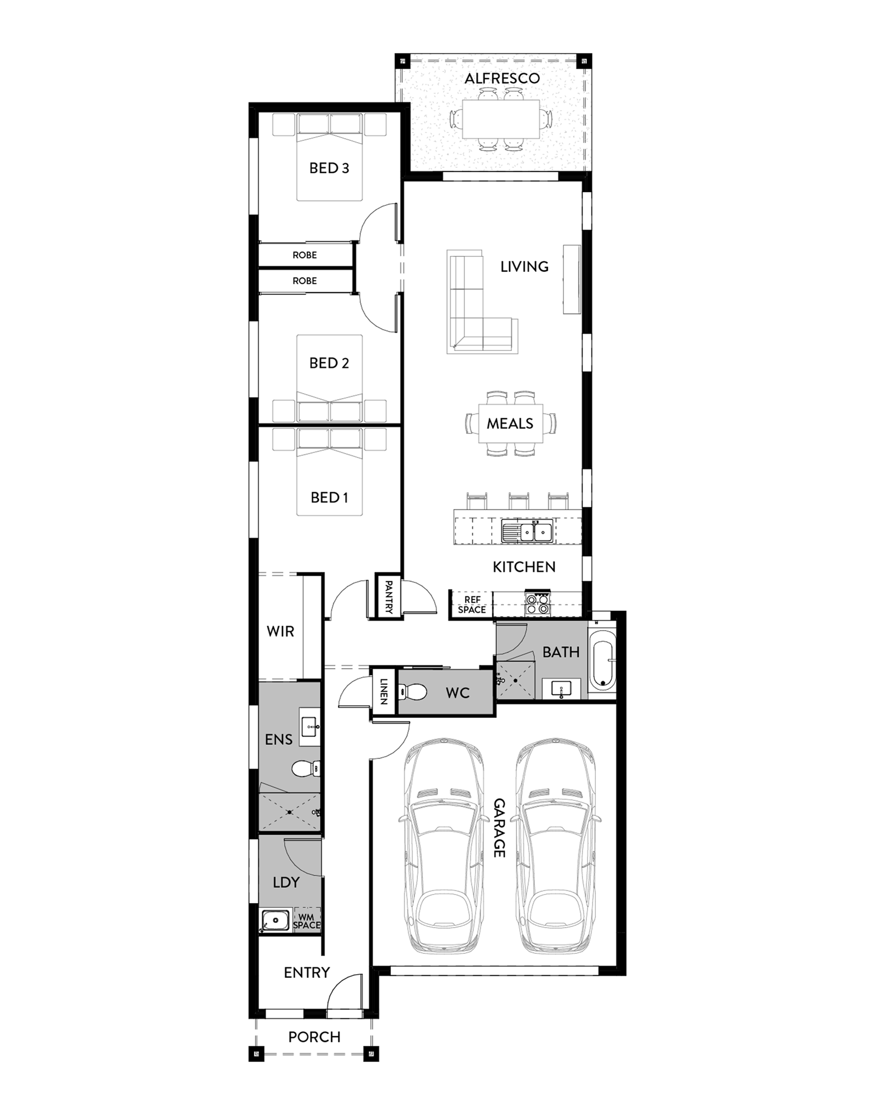With a little extra space compared to its smaller sibling, the Kawana 159, the Kawana 182 adds versatility to a narrow lot home. A double garage, dedicated laundry, butler’s-style pantry and ample storage mean practicality is always front of mind. Choose from a range of modern or traditional façades to personalise your look. As part of our Luma Range of narrow lot home designs, the Kawana 182 offers exceptional value and flexibility. To learn more about this house plan and building with us in South East Queensland, contact Hallmark Homes today!