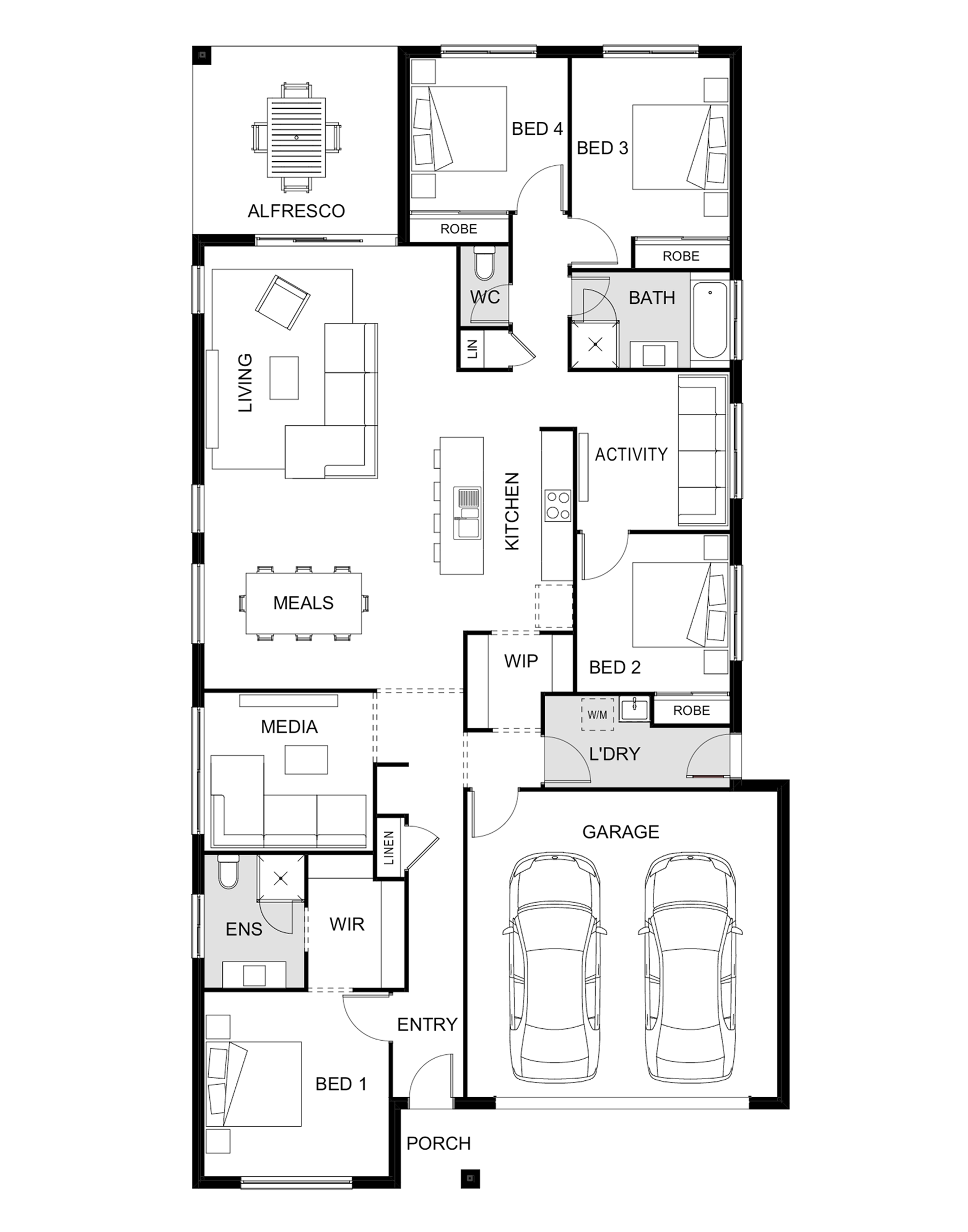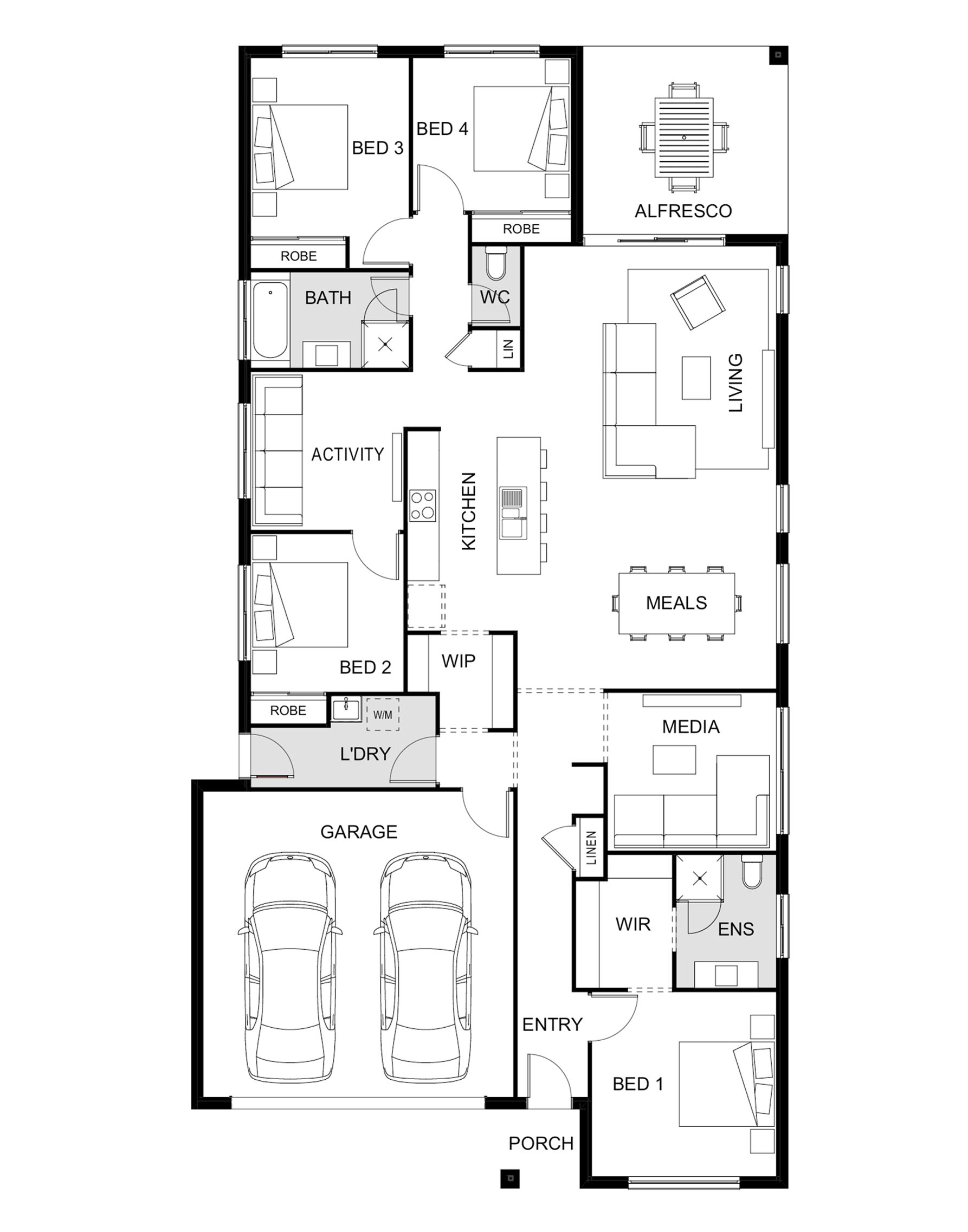 Another popular addition to the Luma home designs range from Hallmark Homes and available in a range of stunning façades to suit all design preferences, the four-bedroom Manly 223 is a true family home. This outstanding house plan features separate activity and media rooms, making it an ideal single-storey home design for growing families and ensures there’s ample space for all to live an enviable South East Queensland lifestyle at home.