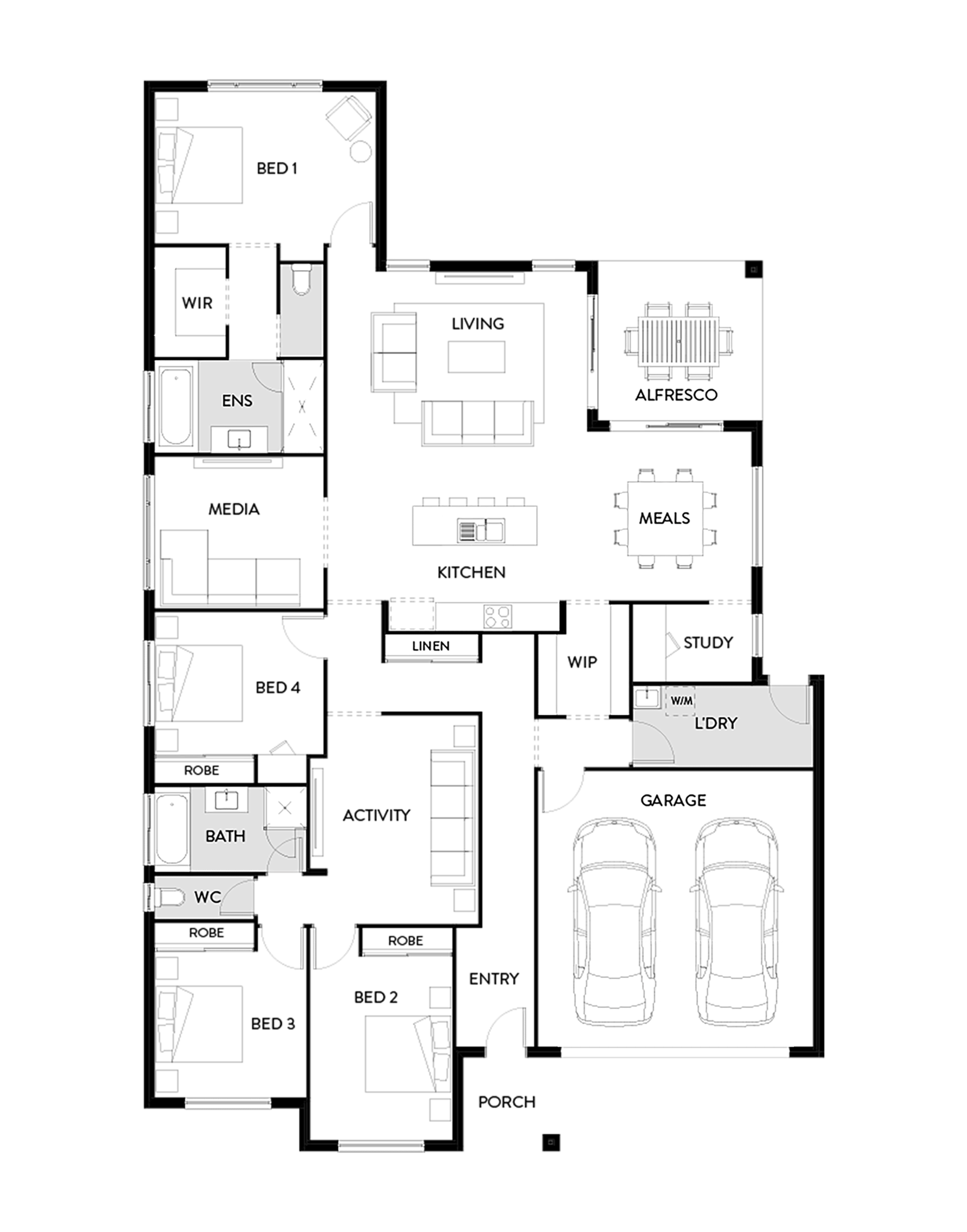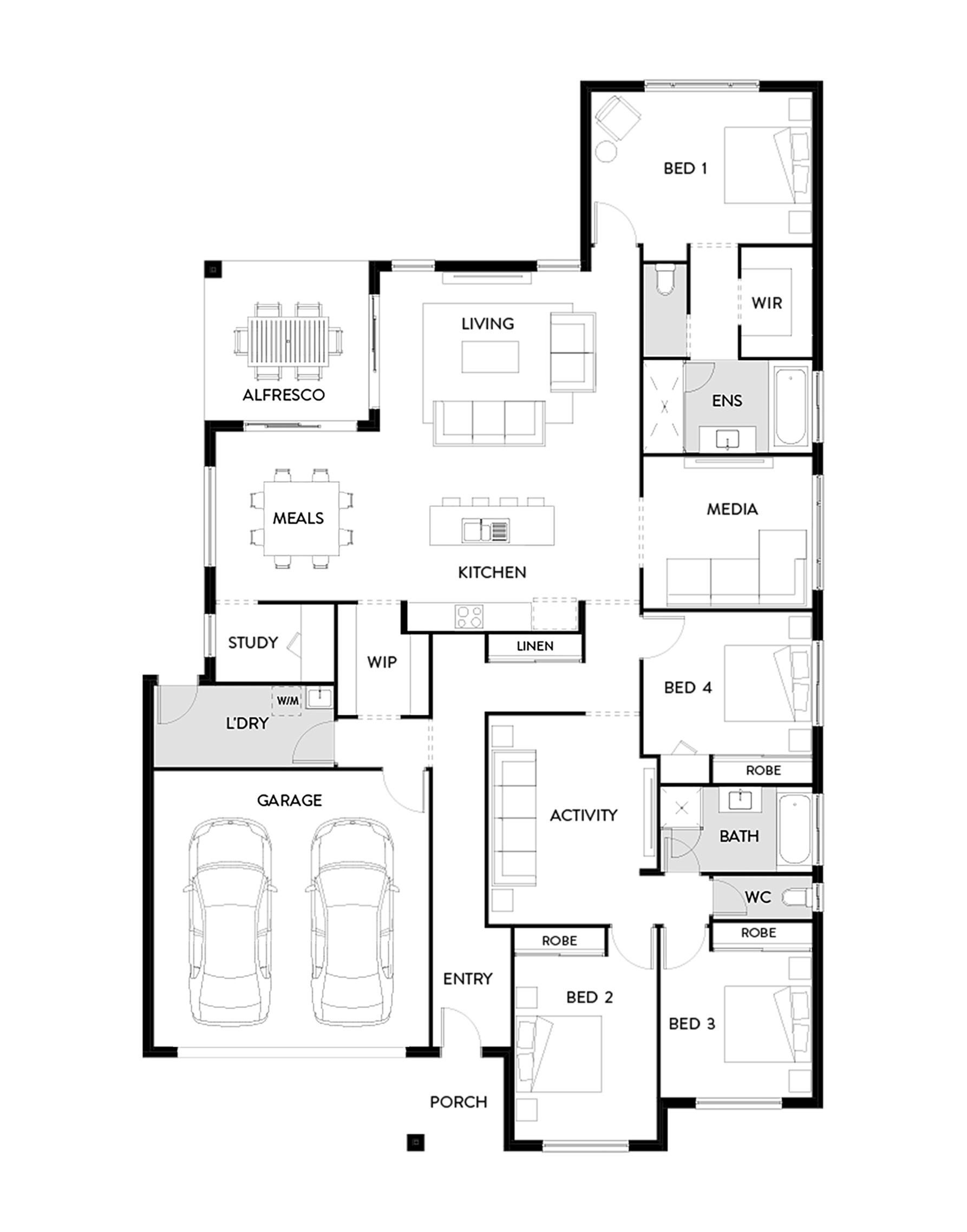 The Linden 261 by Hallmark Homes is a versatile and spacious home best suited to a 16m lot. In this floor plan, the front of the home is a children’s retreat, with three bedrooms situated off the conveniently located activity zone. Upon entering the living and dining area, you’ll notice just how spacious this home design is. The kitchen is centrally located and has a walk-in pantry leading to a hidden laundry room, while the private master suite has a spacious walk-in robe and ensuite. With a separate media room and study, this home really has it all.
