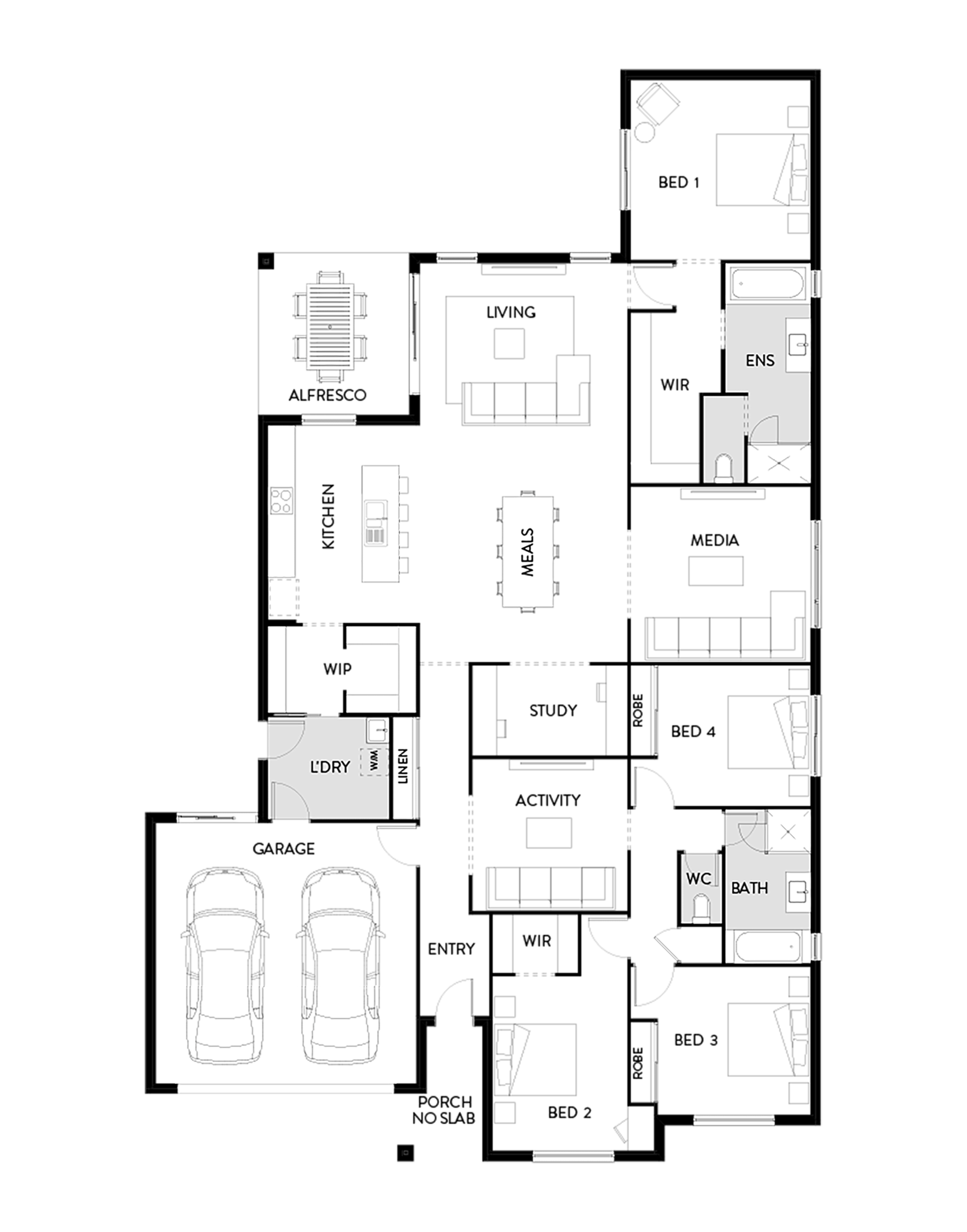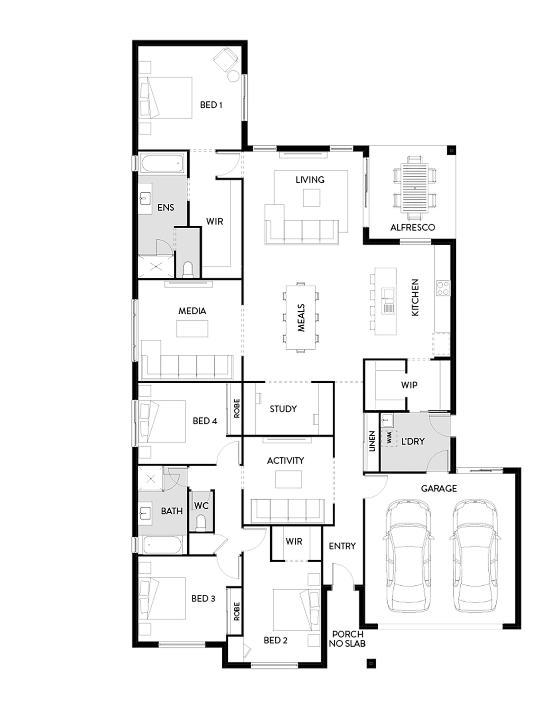 The Myrtle 278 is a functional home design best suited to an 18m lot frontage. The design incorporates a separate wing at the front of the home for three-bedrooms and an activity room. As you make your way through the gallery, you’ll be greeted by an open-plan living, dining and alfresco area, plus a dual study room. The gourmet kitchen has a large walk-in pantry which then flows through to a hidden laundry. The spacious master suite is privately tucked away at the rear of the home and includes a generous walk-in robe and ensuite.