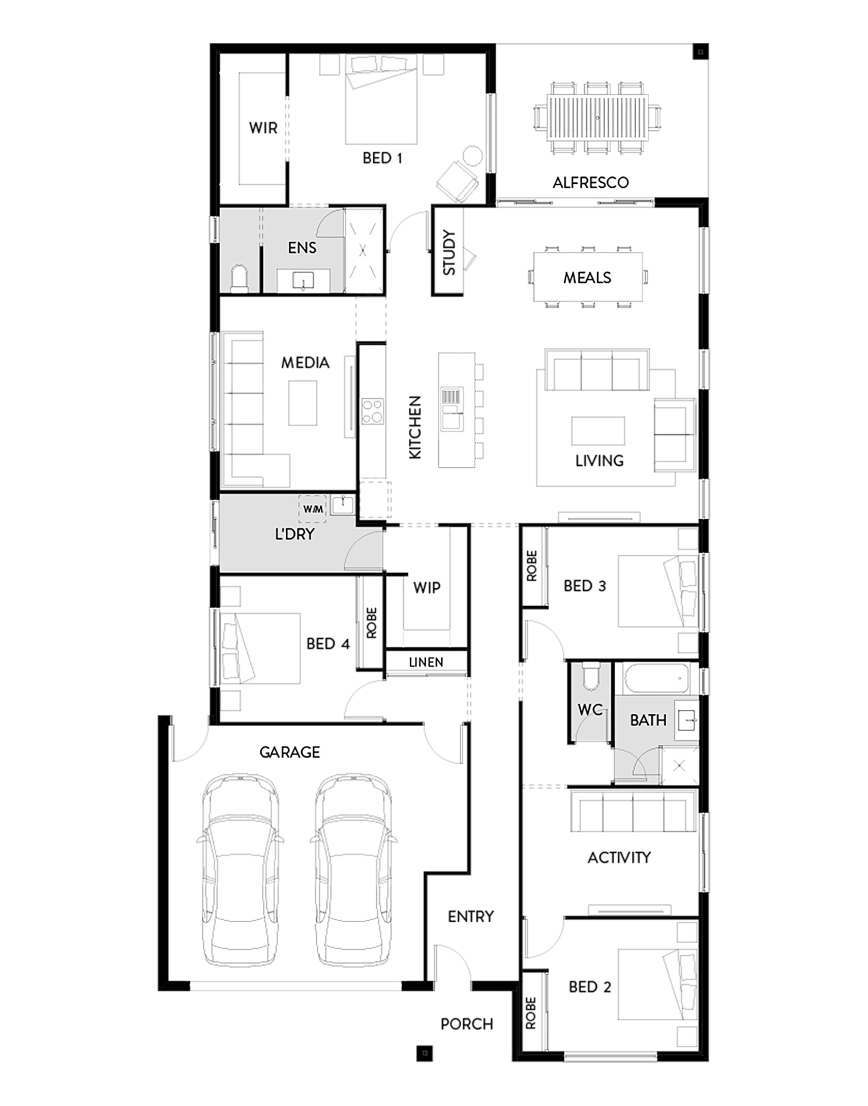 The open-plan living area and alfresco of the Tallowwood 261 creates the ultimate central hub, adding a spacious feel to this beautiful home design. Cleverly designed, this spacious home has many living zones making it the perfect design for growing families. The gourmet kitchen overlooks the living area making entertaining a breeze, and with plenty of cupboards, this home is not short on storage!